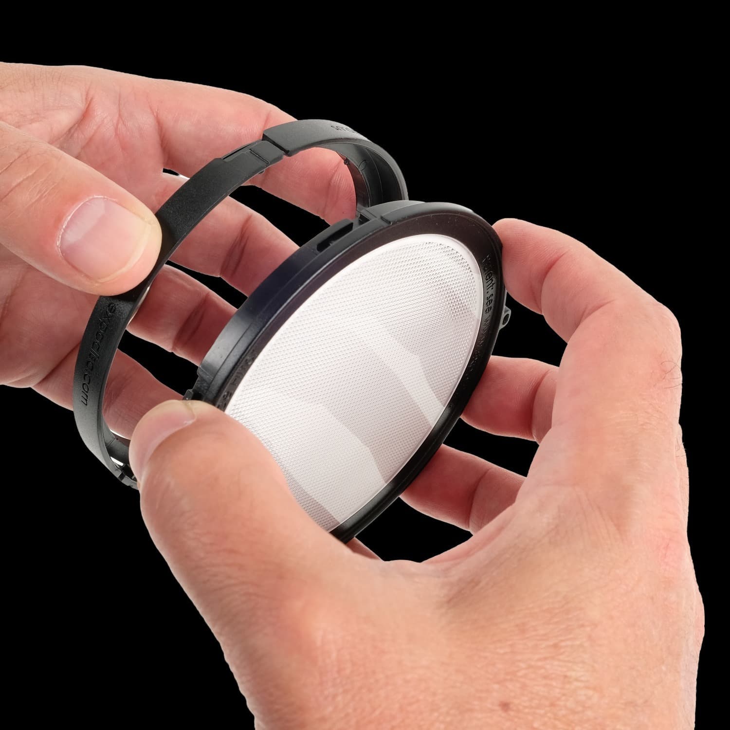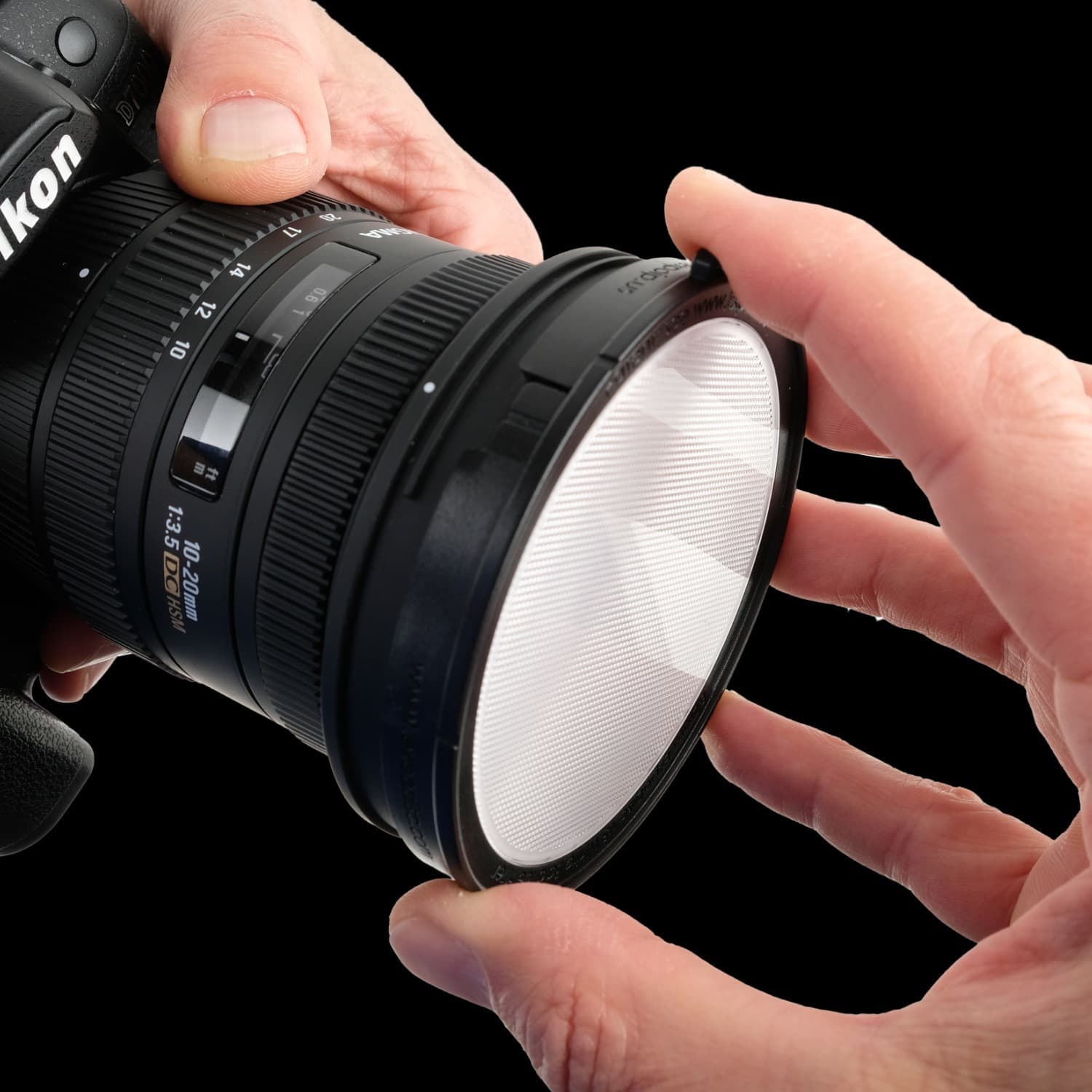 ExpoDisc v3 は 82mm 以下のレンズに快適に装着でき、新しくバヨネット マウントも組み込まれているため、付属の ExpoDisc v3 バヨネットマウントステップリングを使用してレンズに素早く着脱できます。