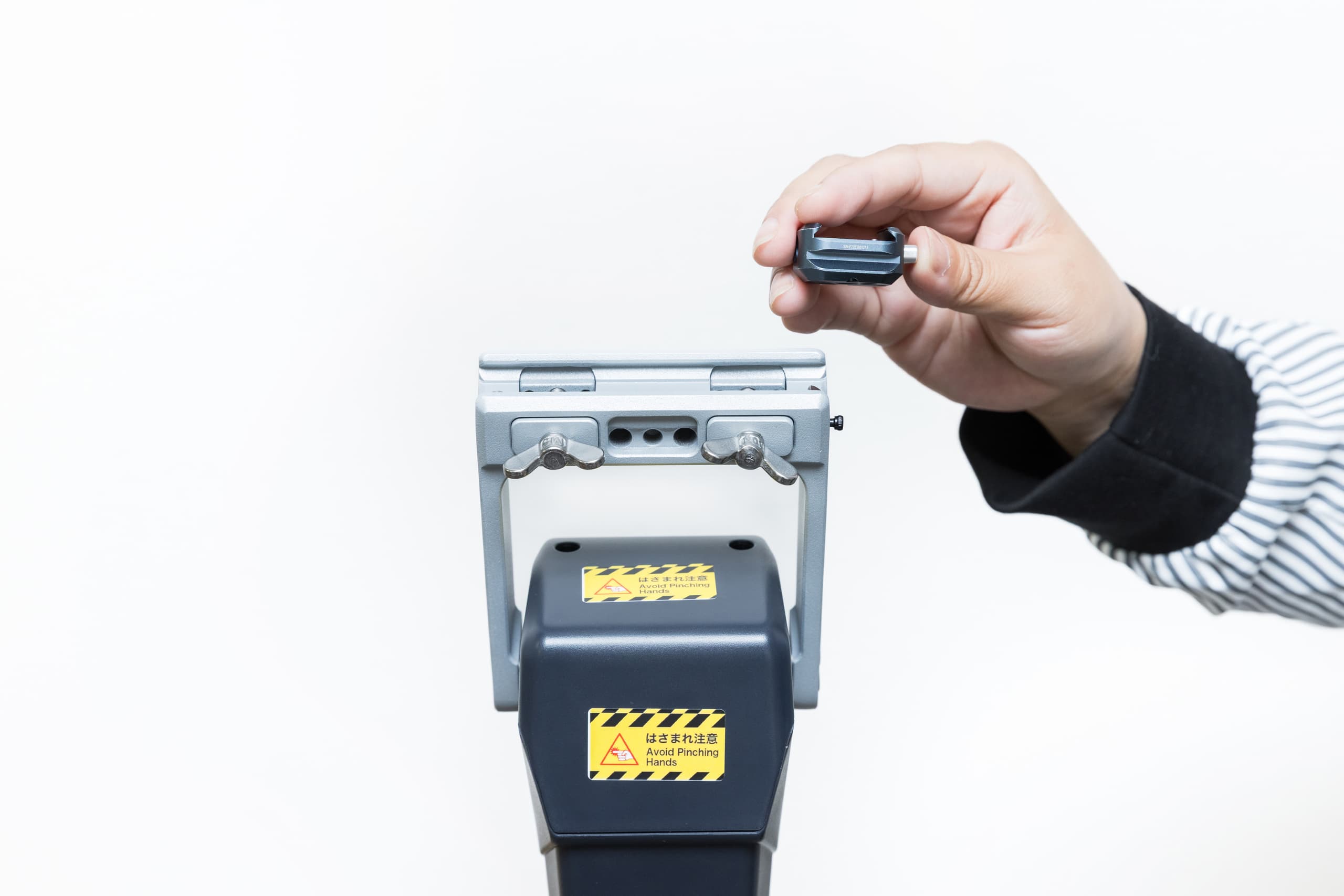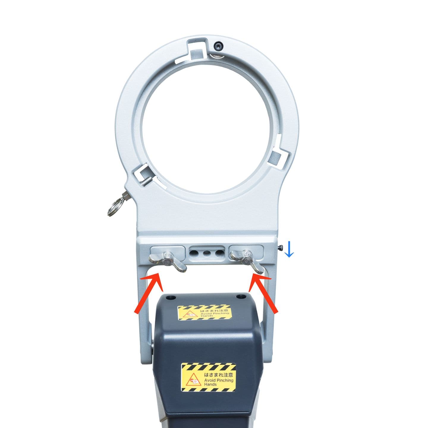 | Move Light GoのBowensマウント部分は正面のネジ(画像内の赤い矢印の2箇所)を緩め、サイドのつまみを青い矢印の方向へスライドすることでる外すことが可能となっている。 |
