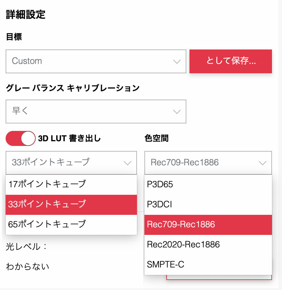 - 3D LUTエクスポート(.cube) ‒ Rec.709、Rec.2020、DCI-P3 規格を使用して、対応するビデオモニターを高精度にキャリブレーション。映画制作や放送ワークフローに最適です。