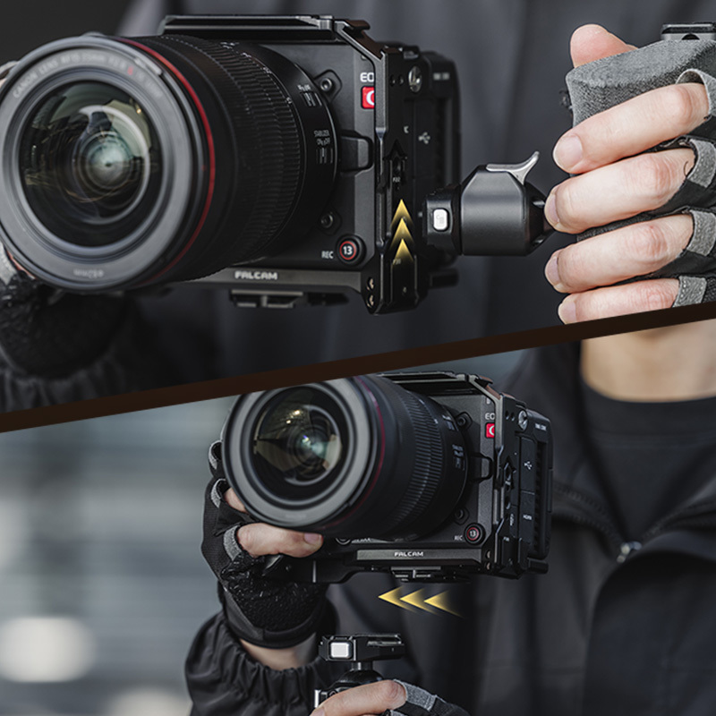 本製品は、FalcamのF22およびF38クイックリリース規格に対応し、三脚や各種リグへのスムーズな着脱が可能です。底面および側面にクイックリリースマウントを備え、縦位置・横位置の撮影切り替えにも対応します。